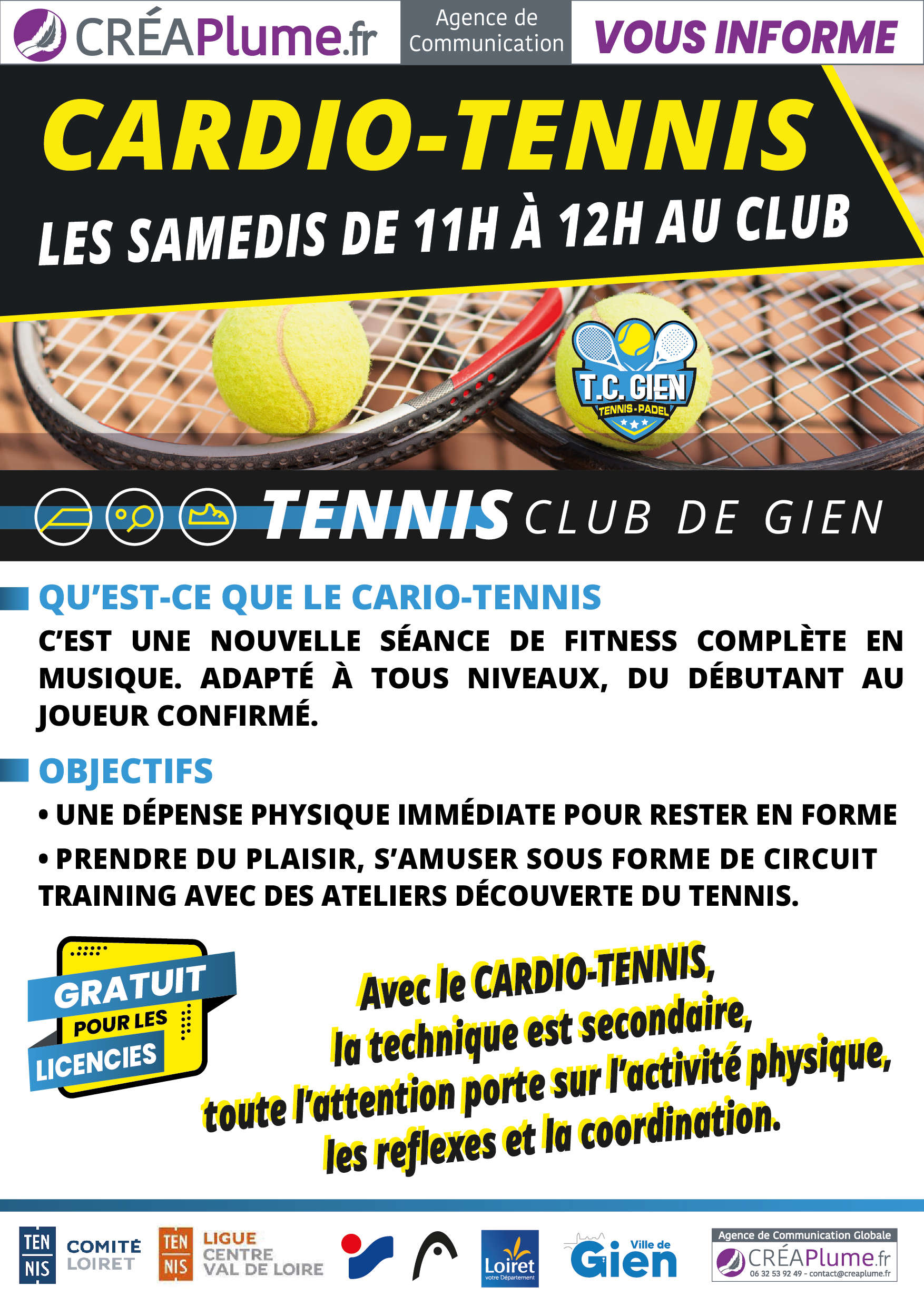 Une dépense physique immédiate pour rester en forme, prendre du plaisir, s’amuser sous forme de circuit training avec des ateliers découverte du tennis.